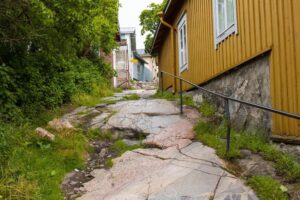 - Brak obrzeży/krawędzi – rozsypywanie kruszywa lub rozjeżdżanie kostki.